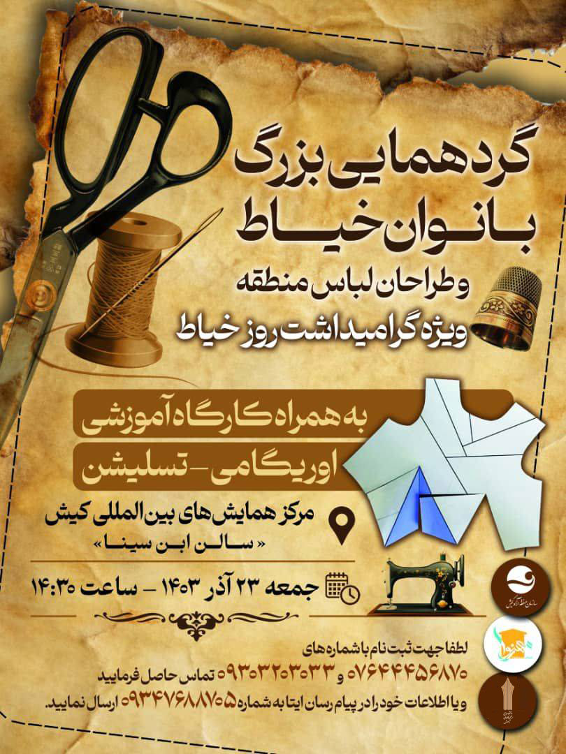 به گزارش روابط عمومی مرکز آموزش علمی کاربردی کیش، به مناسبت گرامیداشت روز خیاط، گردهمایی بزرگ بانوان خیاط و طراحان لباس منطقه با همکاری انجمن علمی دانشجویی طراحی لباس مرکز کیش دانشگاه جامع علمی کاربردی و اداره امور بانوان و خانواده سازمان منطقه آزاد کیش جمعه ۲۳ آذر ۱۴۰۳ در سالن ابن سینا مرکز همایش هاى بین المللى کیش برگزار می شود.