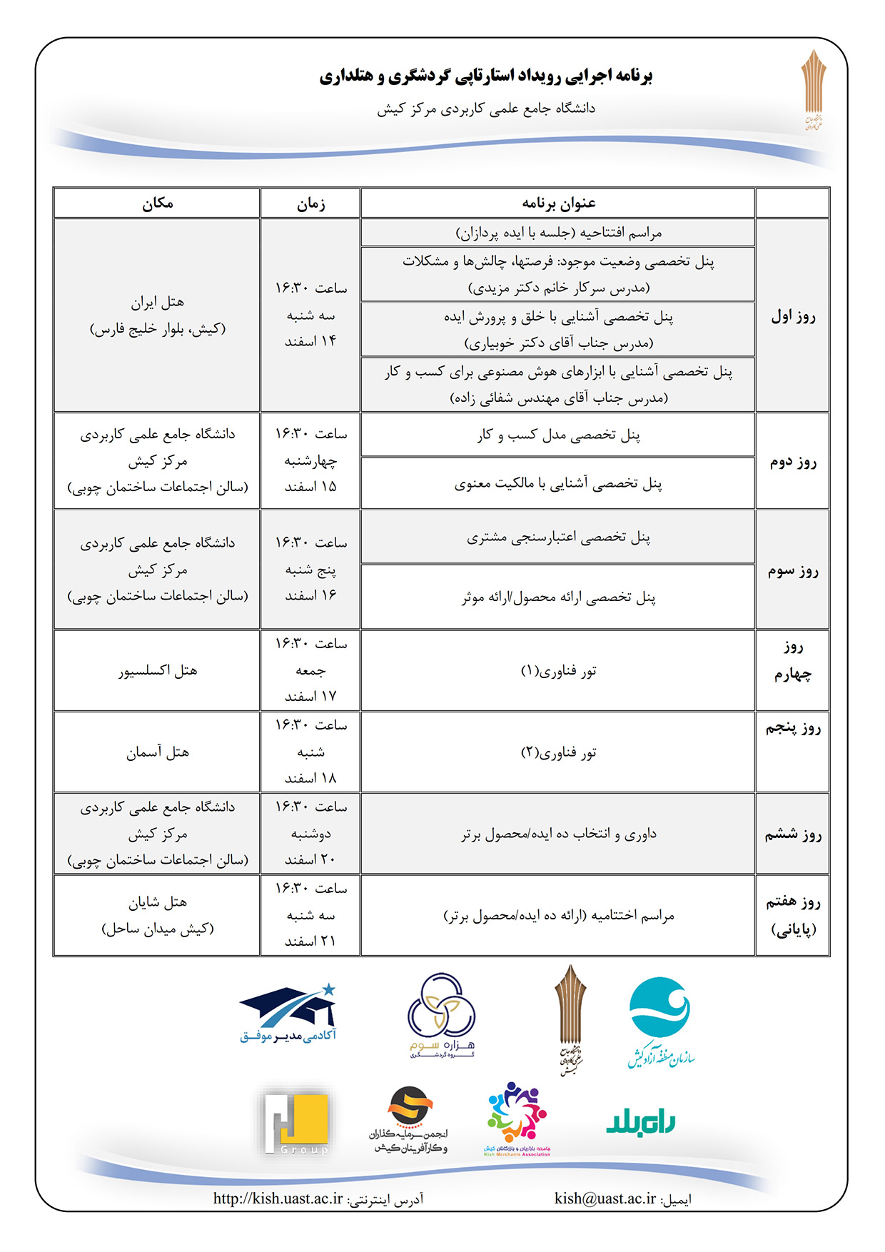 در این رویداد فرصت ها، چالش ها و مشکلات حوزه گردشگری و هتلداری در جزیره کیش بررسی می شوند، کارگاه های آموزشی و تور فناوری برگزار می شود و در نهایت ایدهپردازان و کسب و کارها در یک فضای رقابتی، ایدههای خود را به سرمایهگذاران، داوران و تماشاگران ارائه مینمایند.