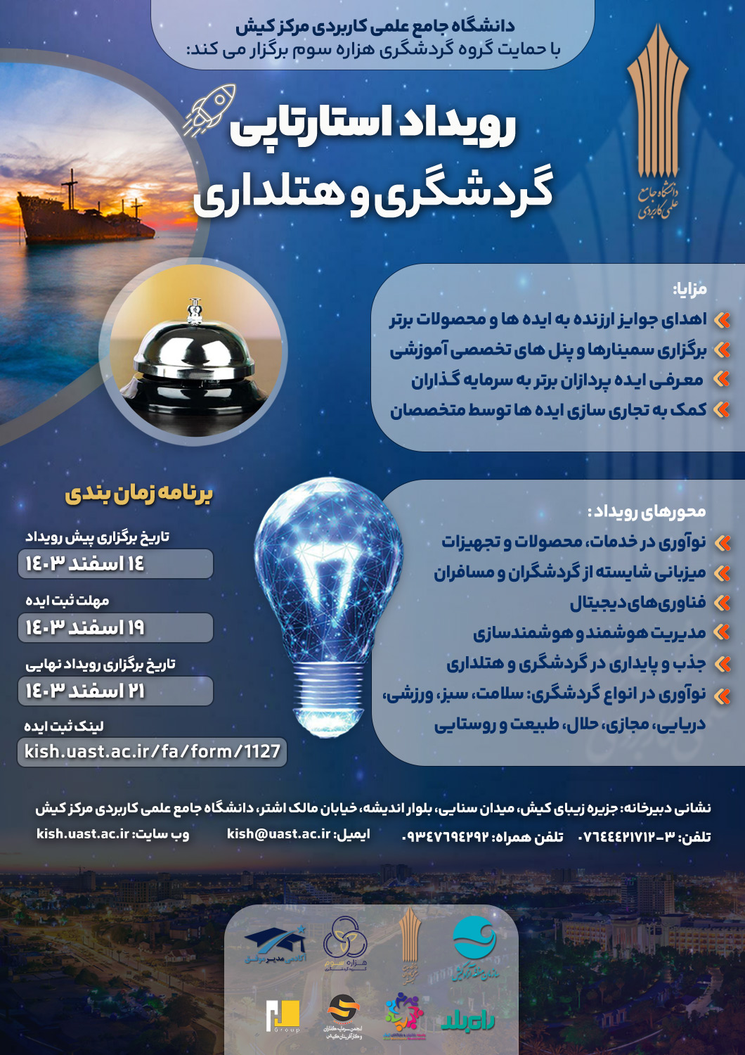 دانشگاه جامع علمی کاربردی مرکز کیش در نظر دارد، رویداد استارتاپی گردشگری و هتلداری را با مشارکت سازمان ها و ارگانهای مرتبط با همراهی بخش خصوصی و با حضور سرمایه گذاران، تسهیل کنندگان و فعالان هتلداری و گردشگری در جزیره کیش با محورهای : نوآوری در خدمات، محصولات و تجهیزات، میزبانی شایسته از گردشگران و مسافران، فناوریهای دیجیتال، مدیریت هوشمند و هوشمندسازی، جذب و پایداری در گردشگری و هتلداری، نوآوری در انواع گردشگری: سلامت، سبز، ورزشی دریایی، مجازی، حلال، طبیعت و روستایی برگزار نماید.
