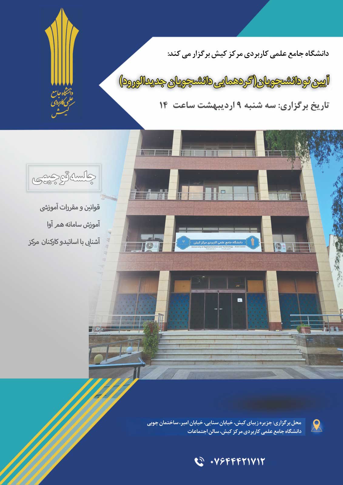 زمان و آدرس: سه شنبه 9 اردیبهشت 1404 | ساعت 14:00جزیره زیبای کیش، میدان سنایی، خیابان امیر، دانشگاه جامع علمی کاربردی مرکز کیش(ساختمان چوبی)، سالن اجتماعات
