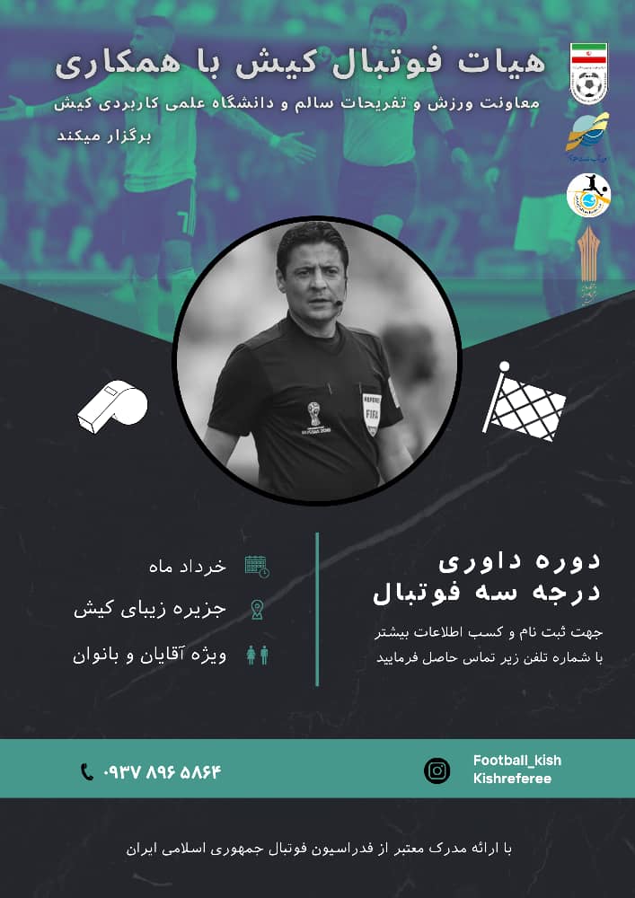 به گزارش روابط عمومی مرکز آموزش علمی کاربردی کیش، دوره داوری درجه سه فوتبال، توسط هیات فوتبال کیش و با همکاری انجمن علمی دانشجویی تربیت بدنی مرکز کیش و معاونت ورزش و تفریحات سالم برگزار می شود. جهت ثبت نام و کسب اطلاعات بیشتر با شماره تلفن همراه 09378965864 تماس حاصل فرمایید.
